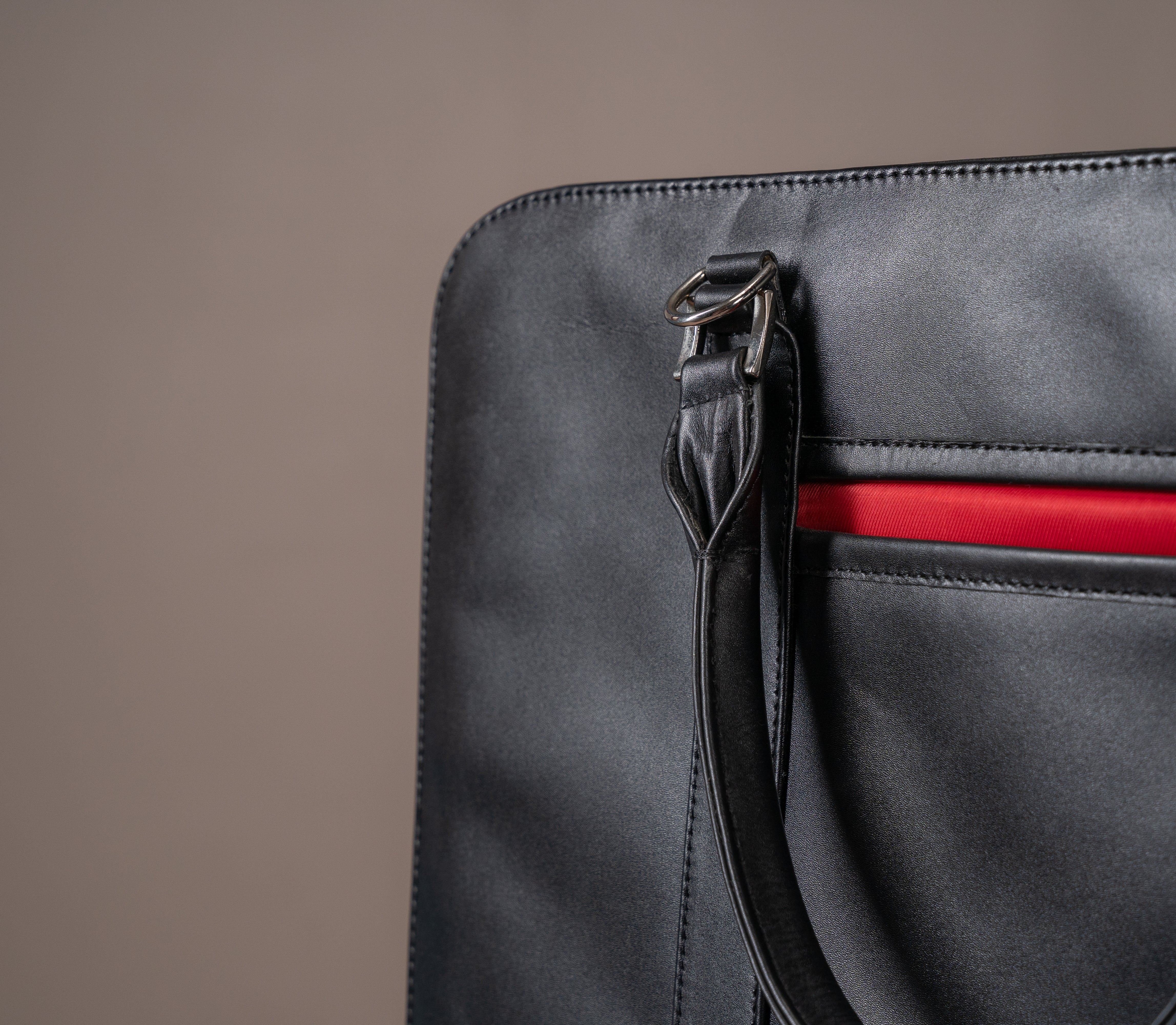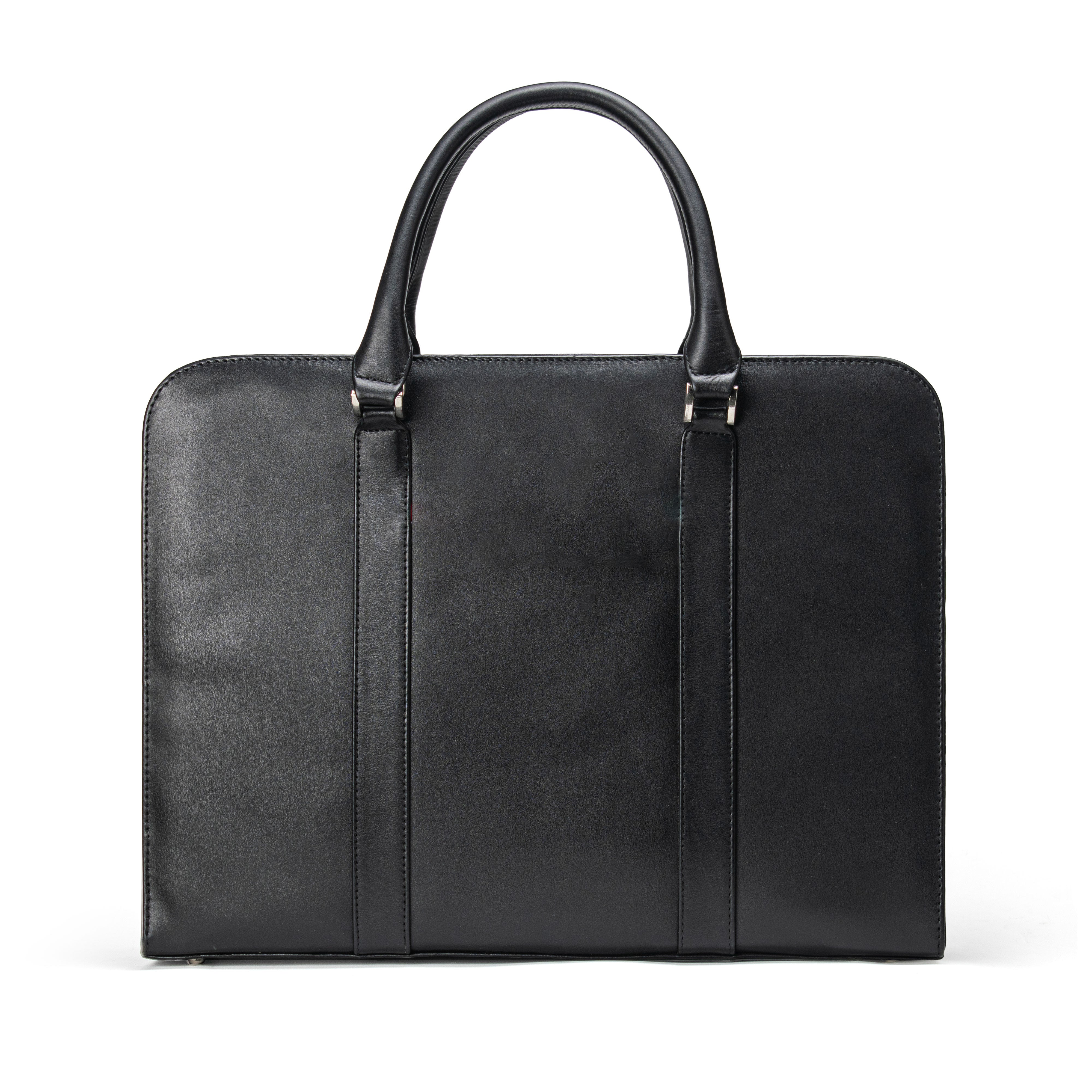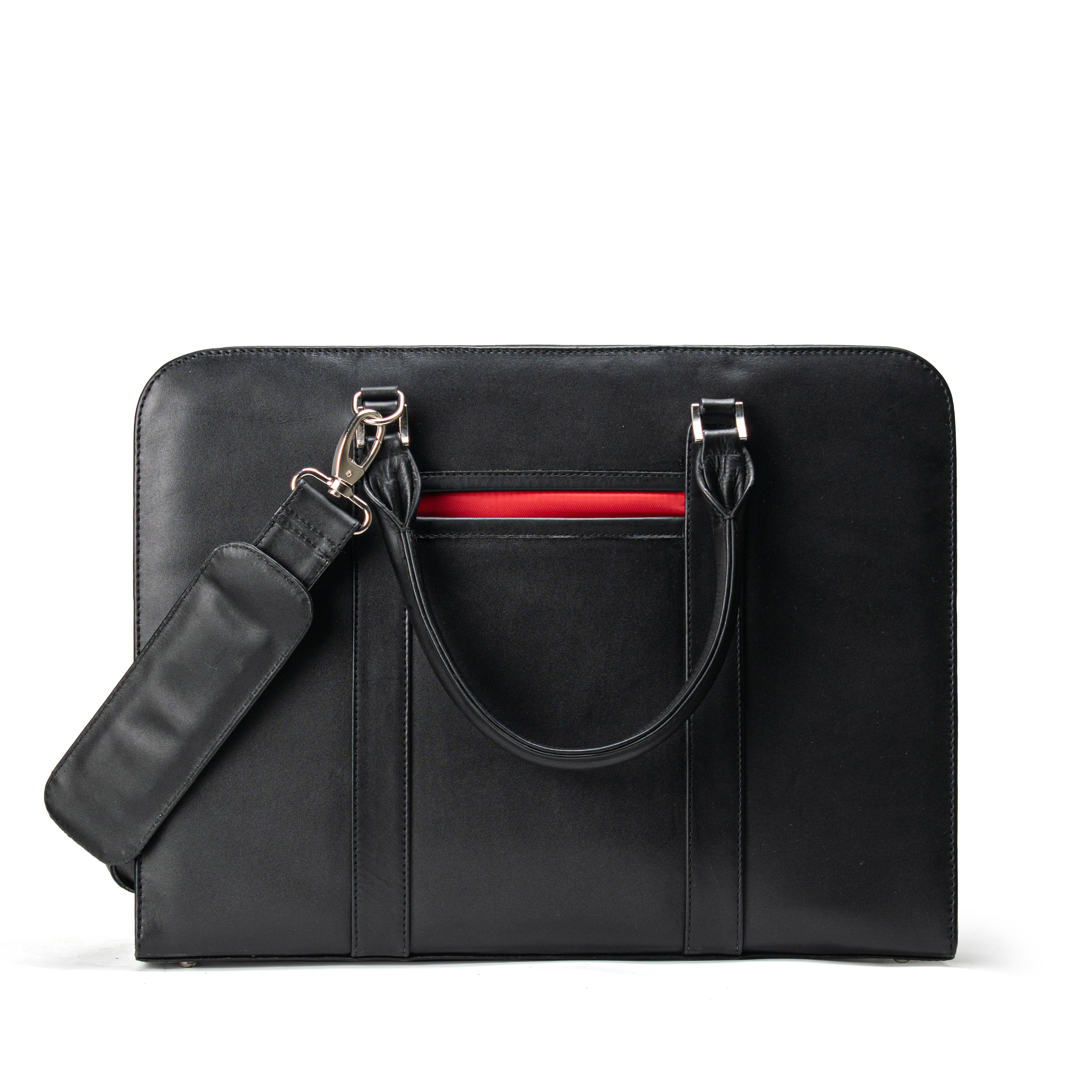 Sleek and stylish, the Blackwood Laptop Bag is crafted from genuine black leather. It features two large compartments, a zippered pocket and three internal pockets to help keep everything organized. The neat front pocket gives it a modern look.