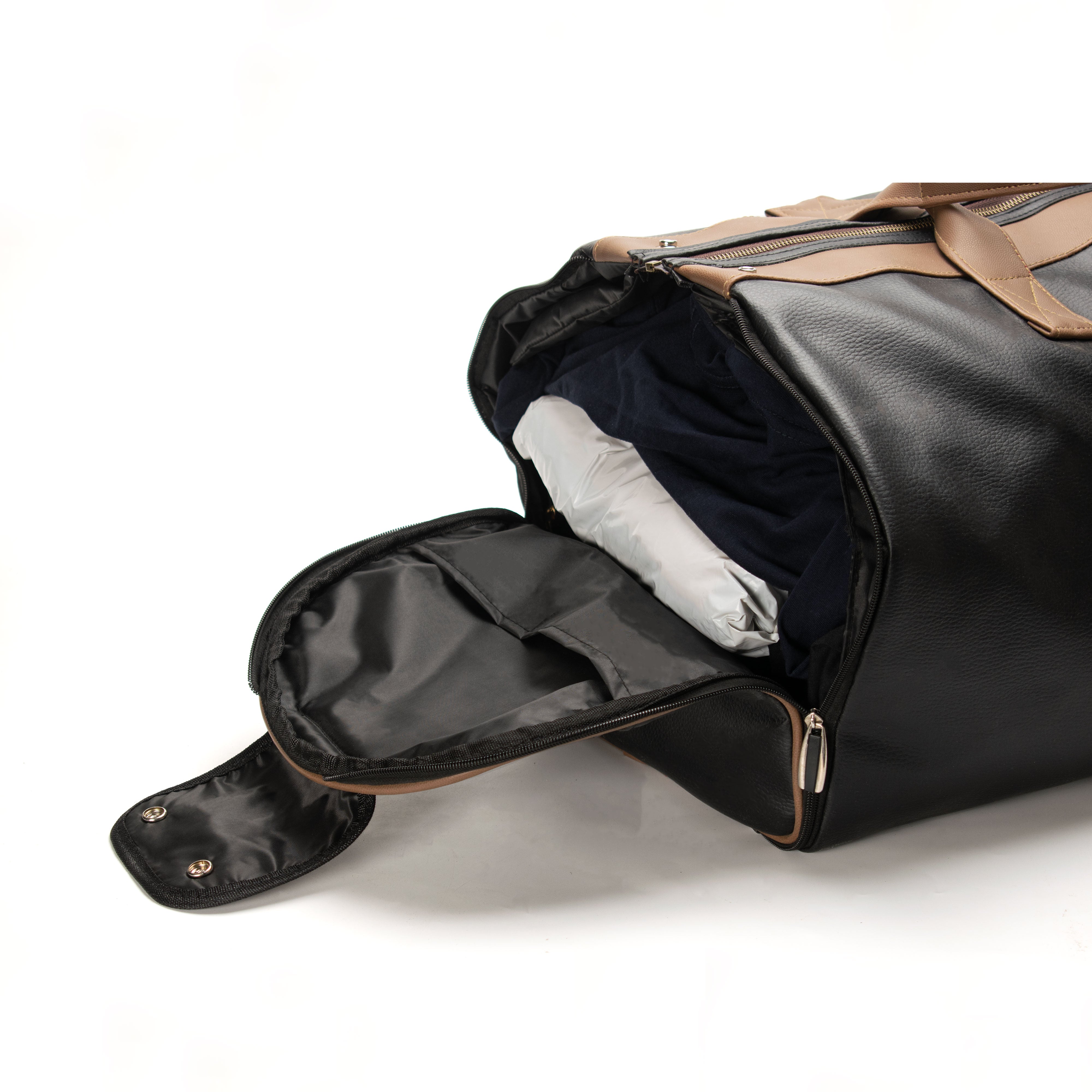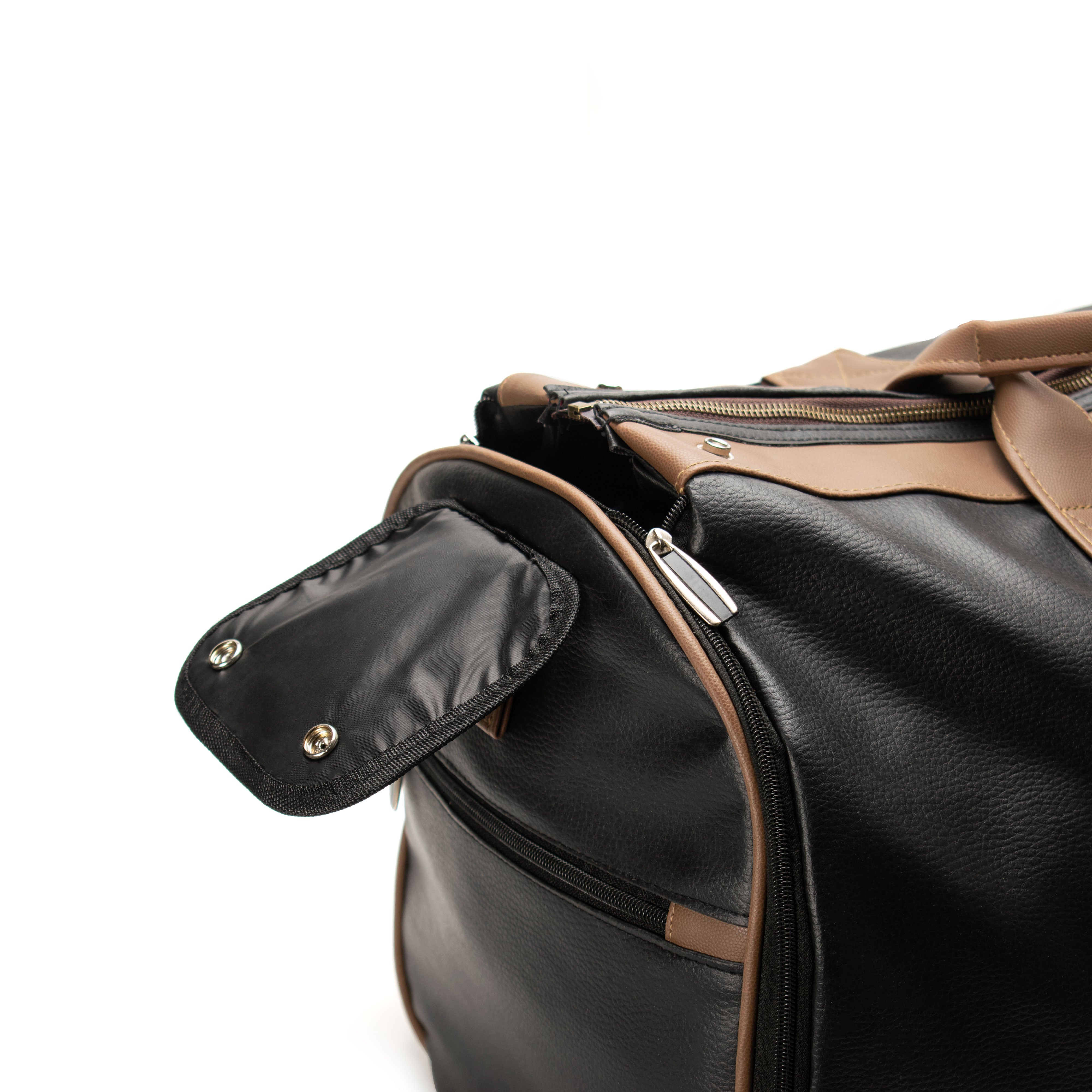 Experience refined sophistication with our elegant black and light brown travel duffel. Expertly crafted from premium materials, this duffel offers exceptional durability and ample storage for discerning travelers. Elevate your journey with this stylish and versatile accessory.