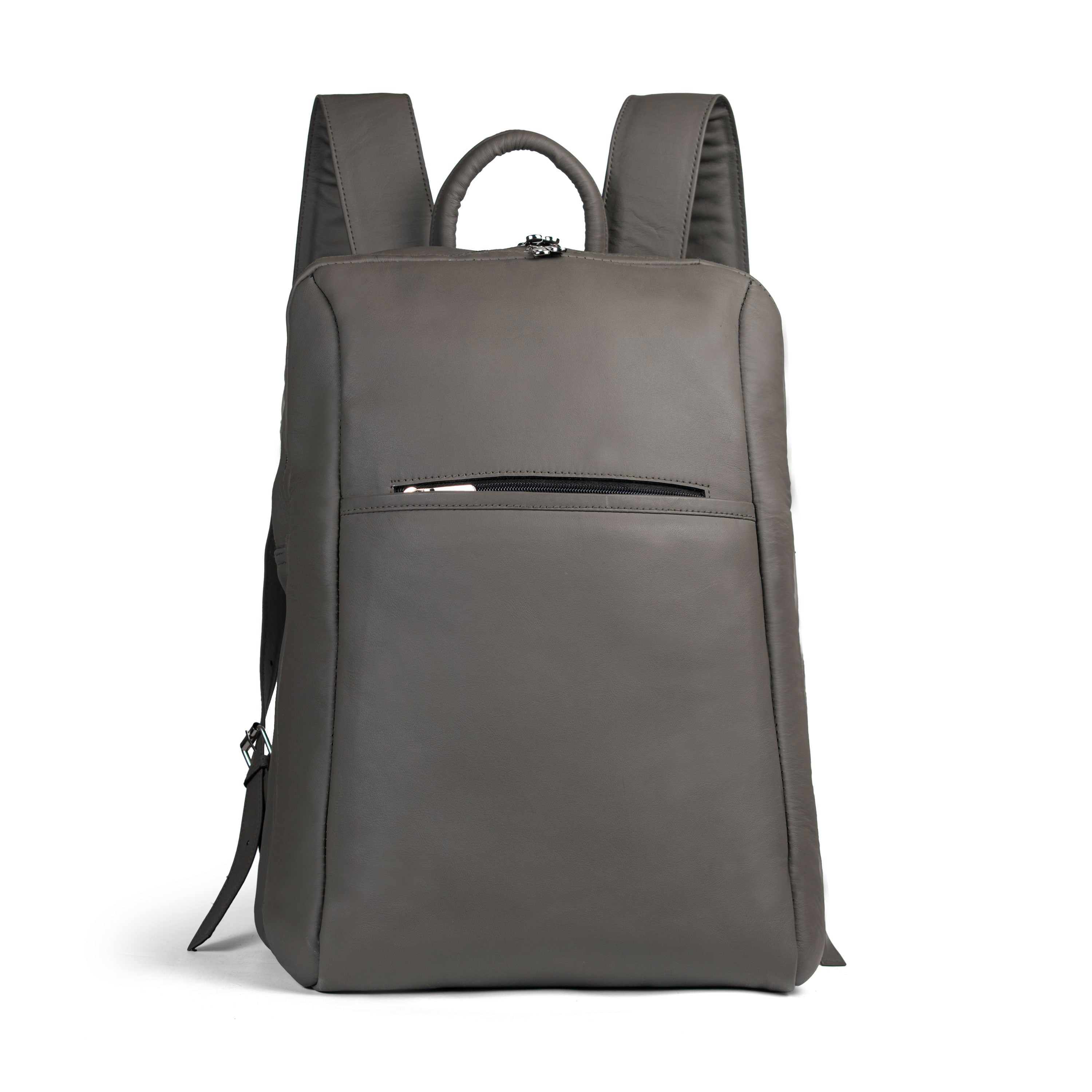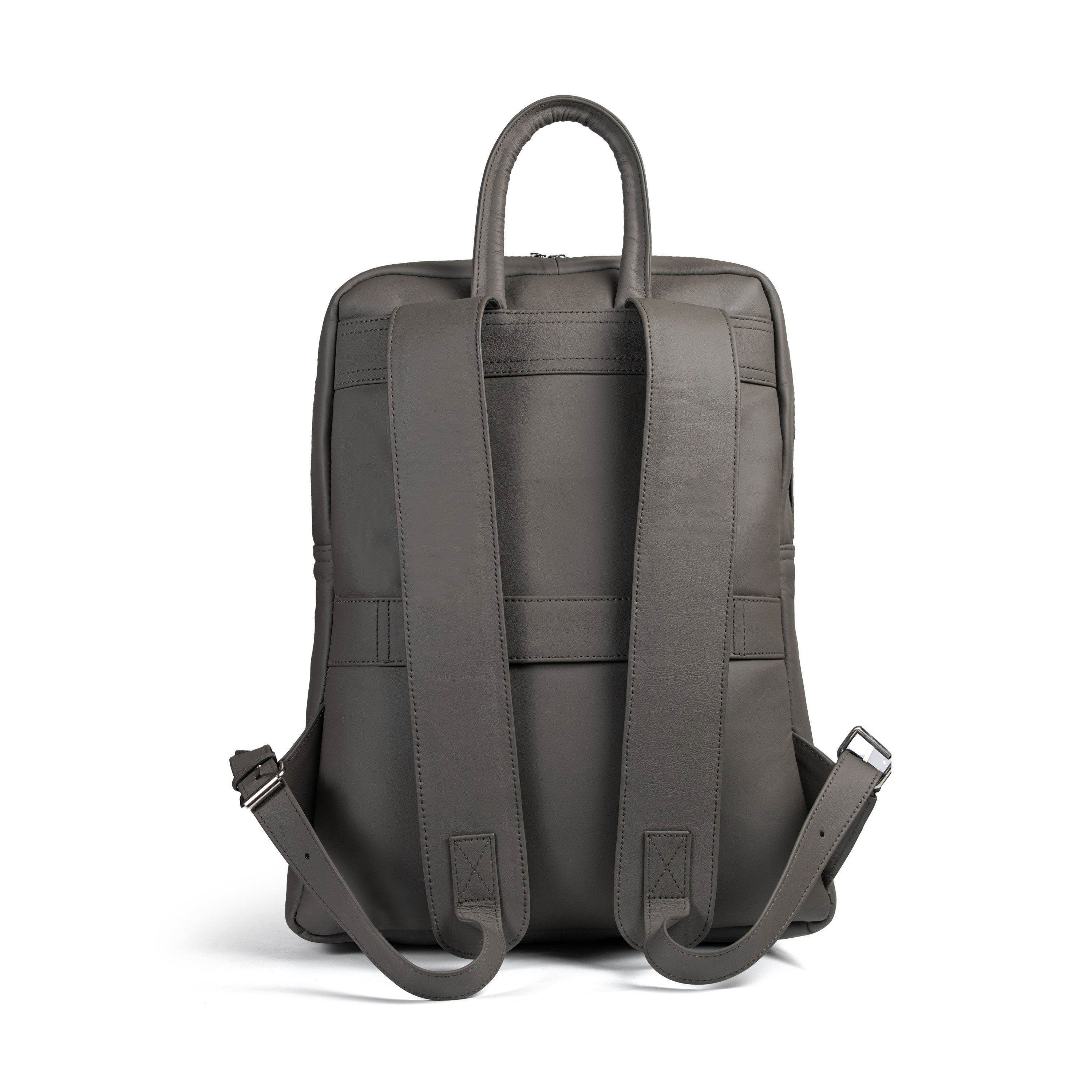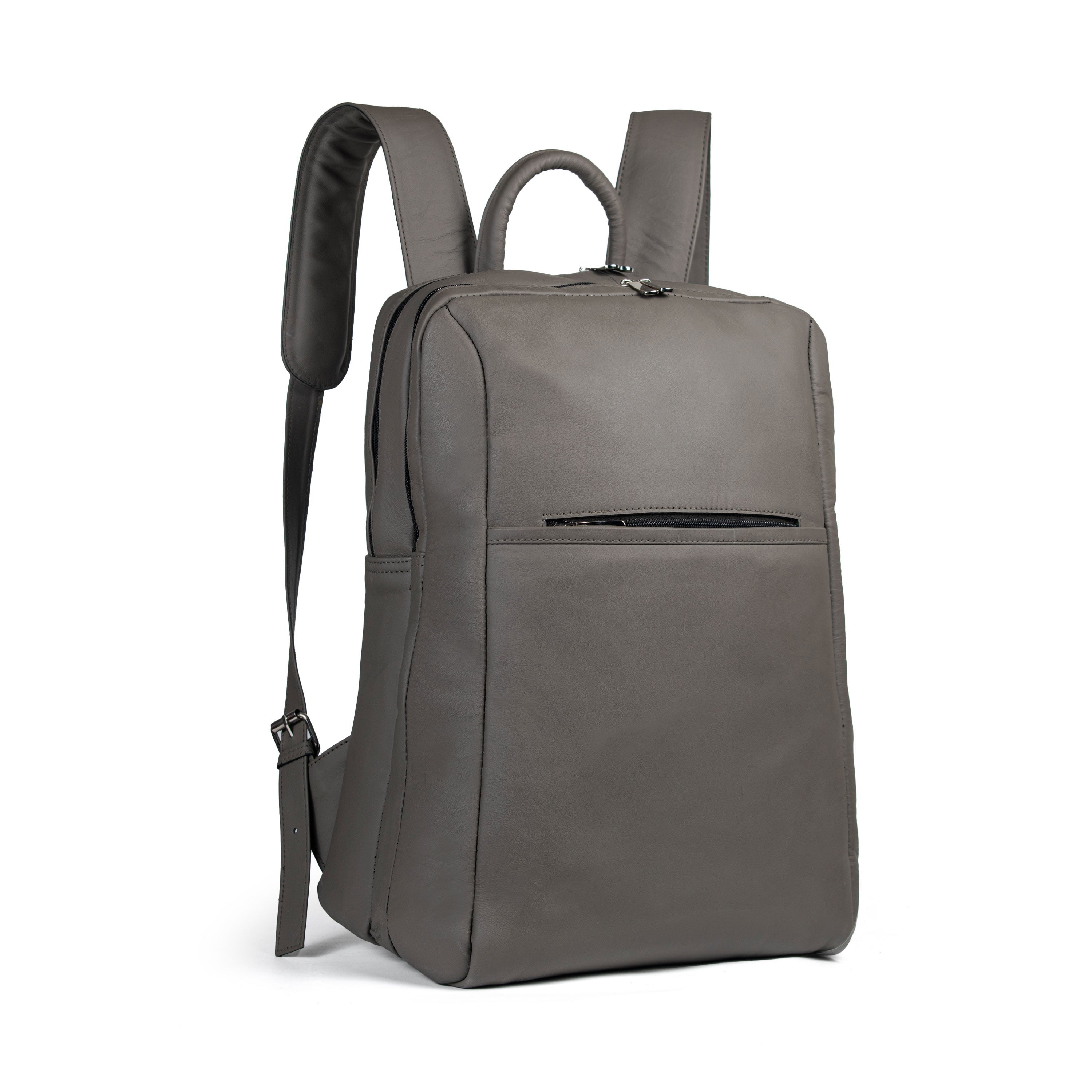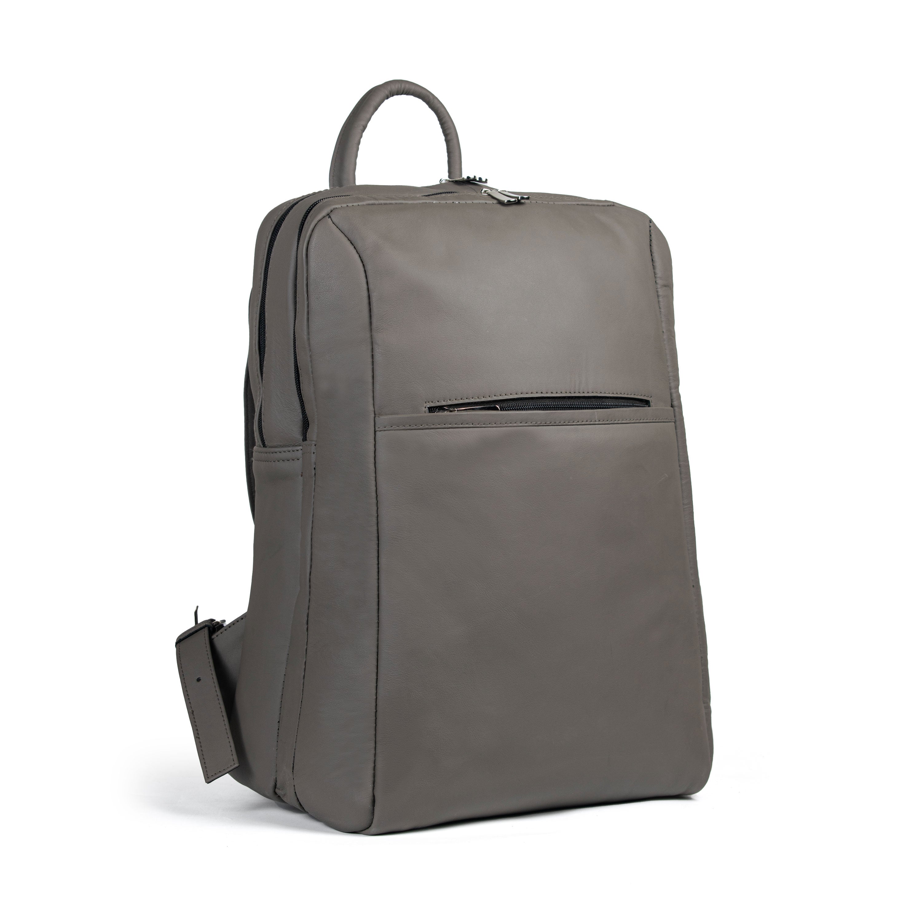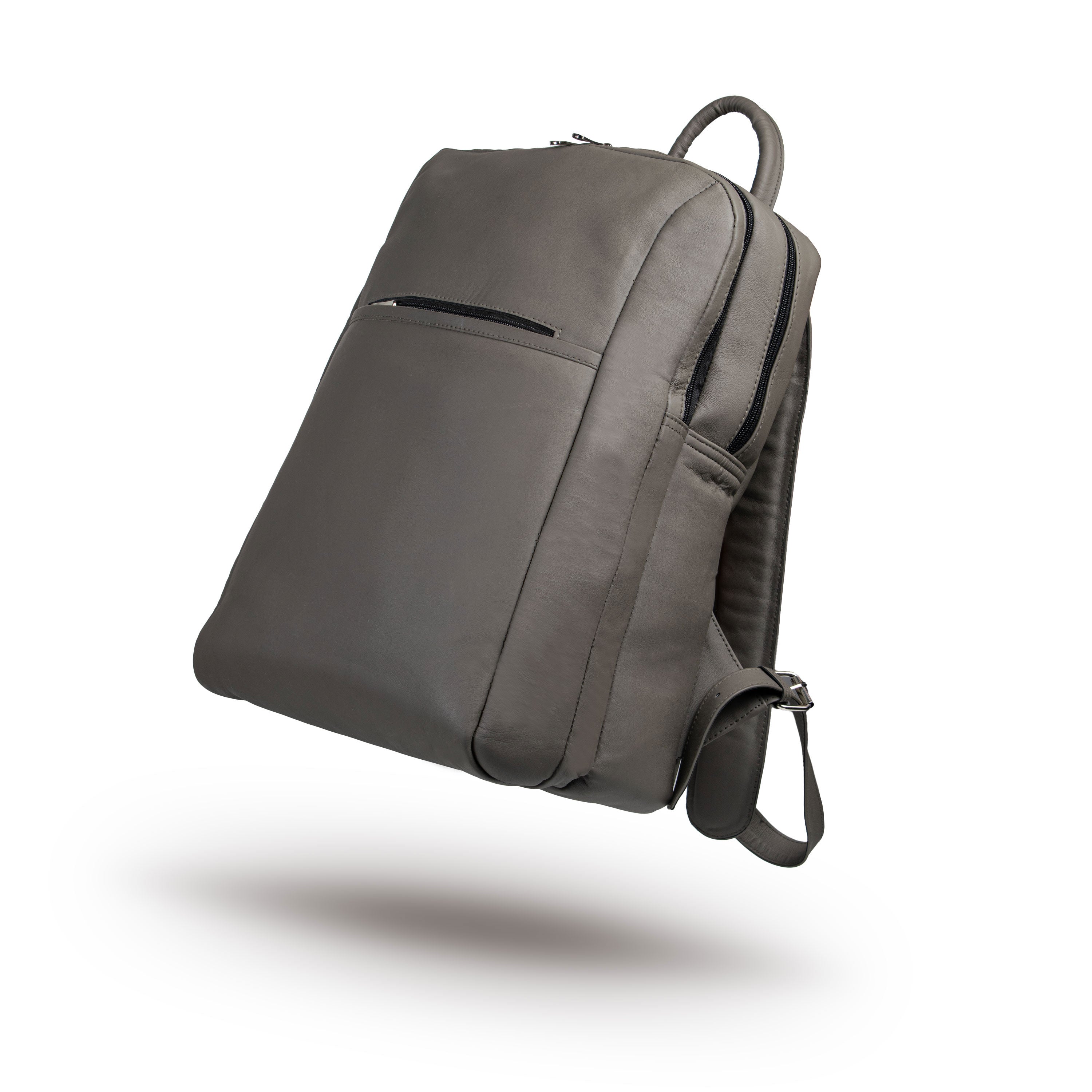 A sleek, urban-style gray cow leather backpack with two main compartments, a laptop pocket, inner zipper, and twin front pockets, designed for confident, on-the-go professionals and explorers.
