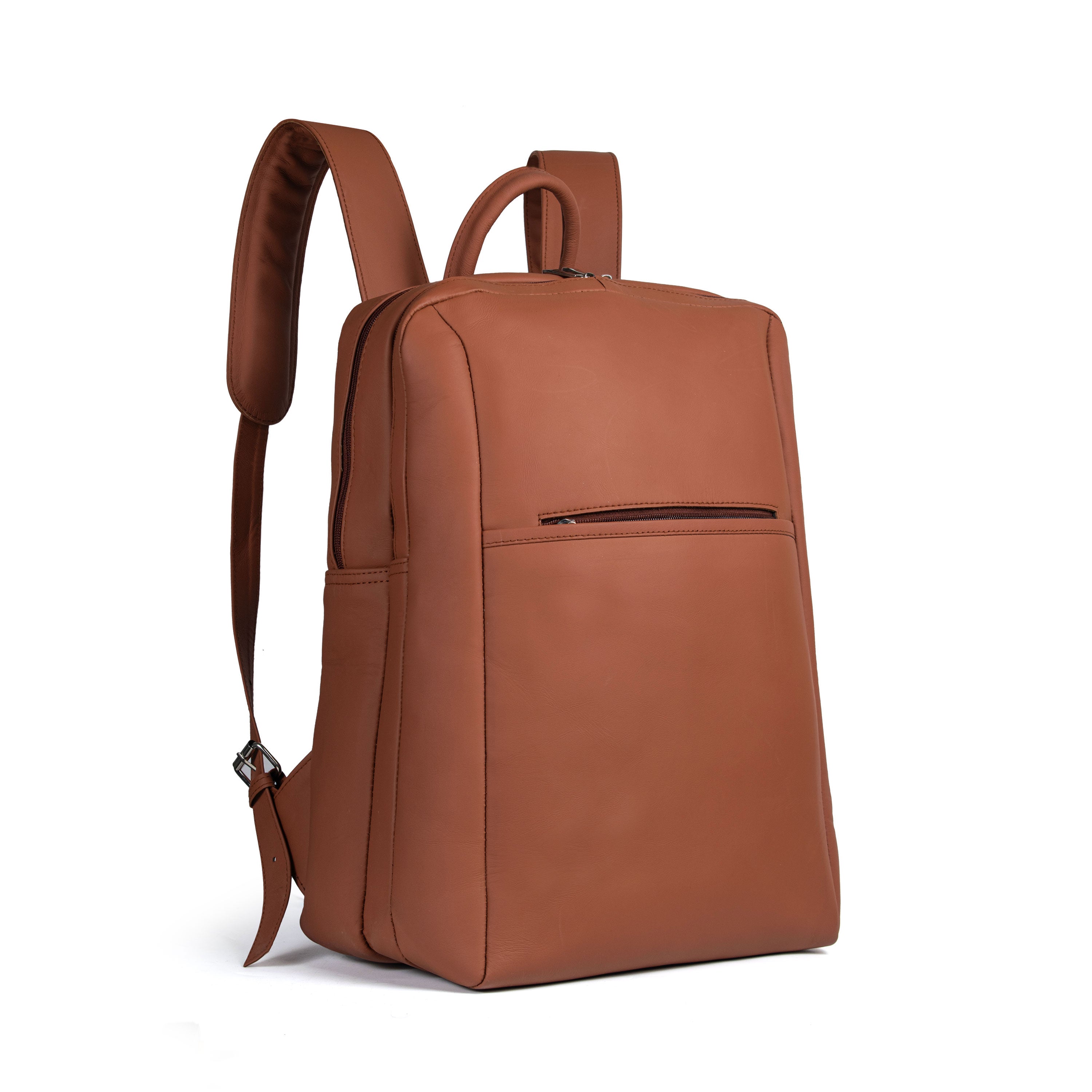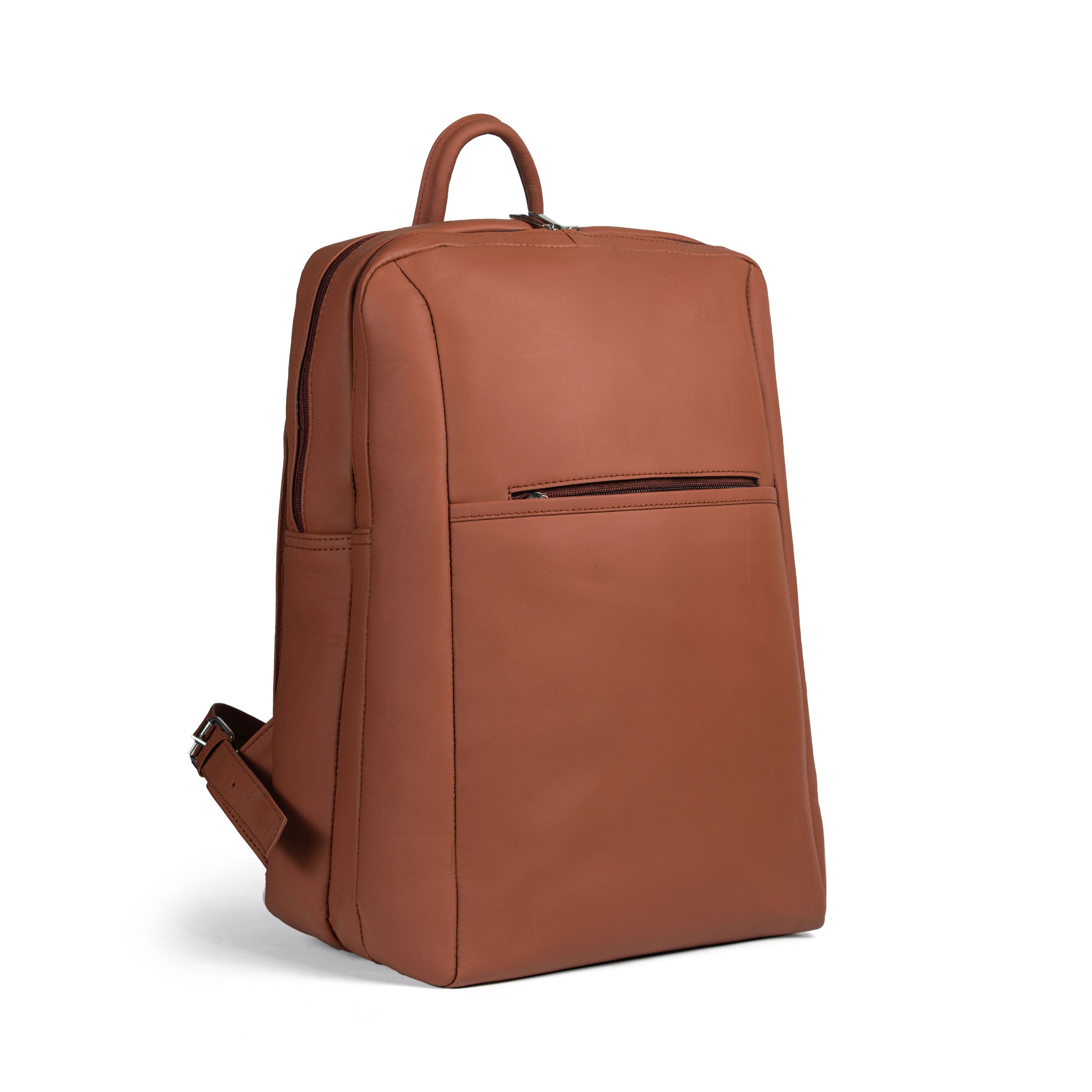A timeless brown cow leather backpack combining classic charm with modern function, featuring two main compartments, a padded laptop pocket, inner zipper slot, and two front pockets for easy access. Built to last and ready for every journey.