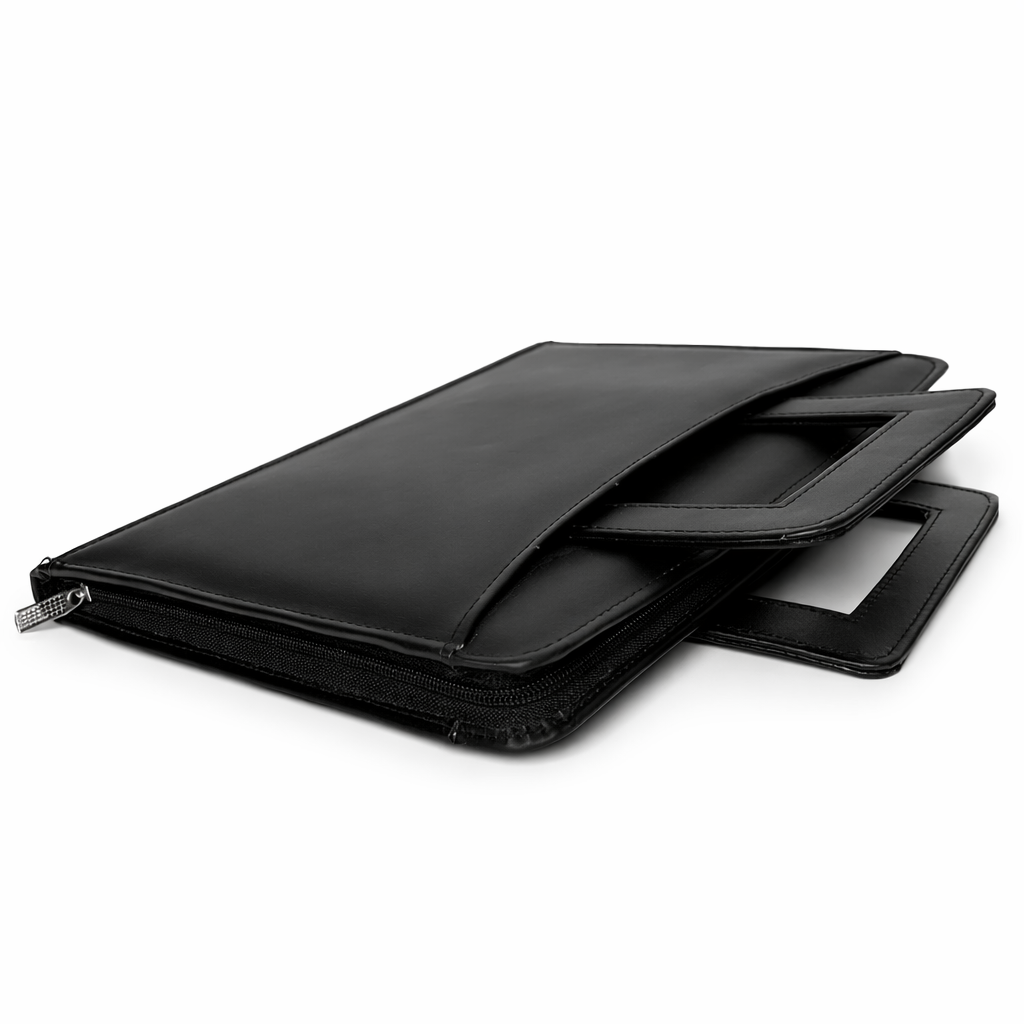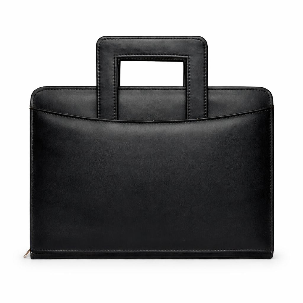 The structured design features a secure zip closure, built-in handle for easy carrying, and a well-organized interior with dedicated slots for cards, documents, notepad, and accessories. Whether you're heading to meetings, presentations, or daily office use, this portfolio keeps everything in one place with a polished appearance.