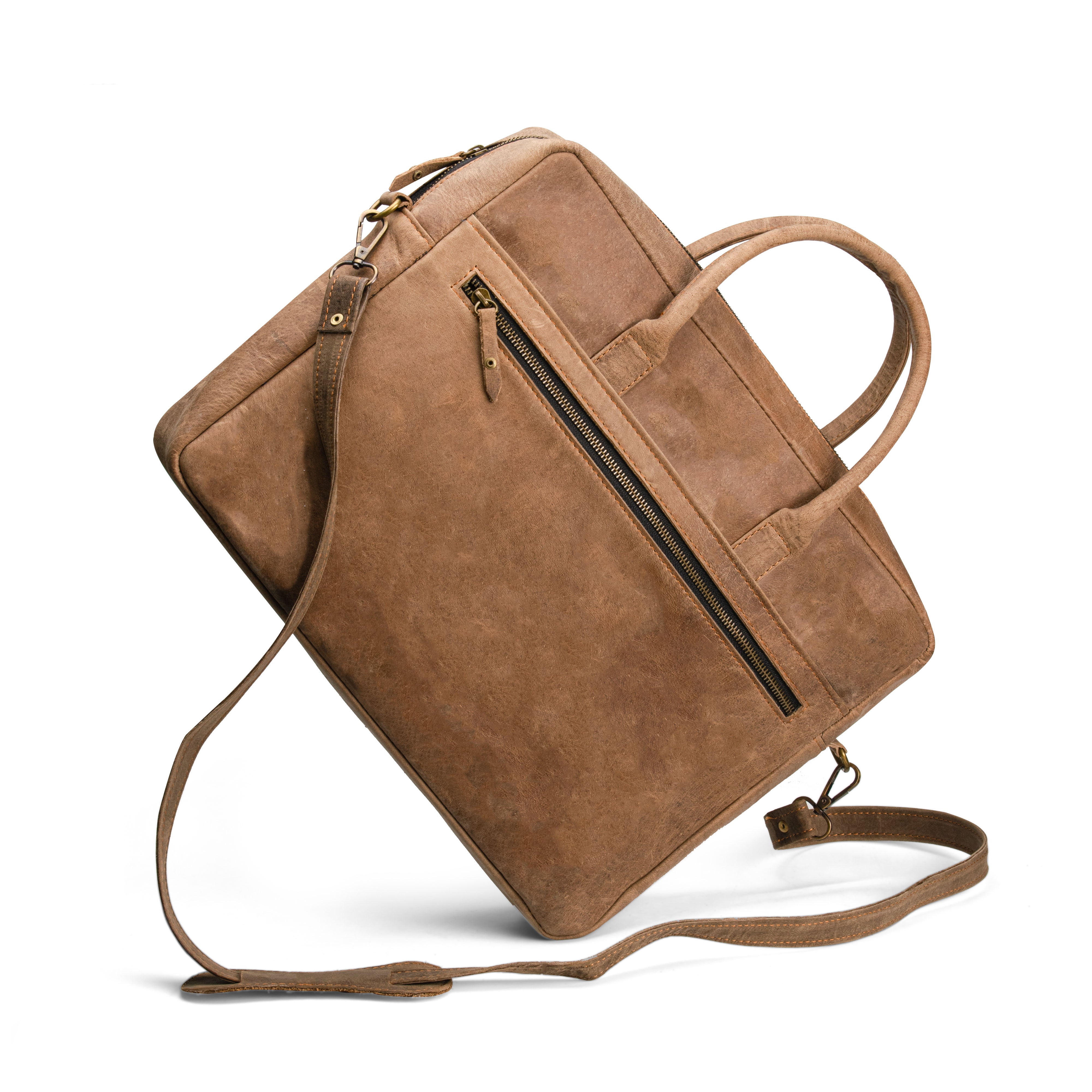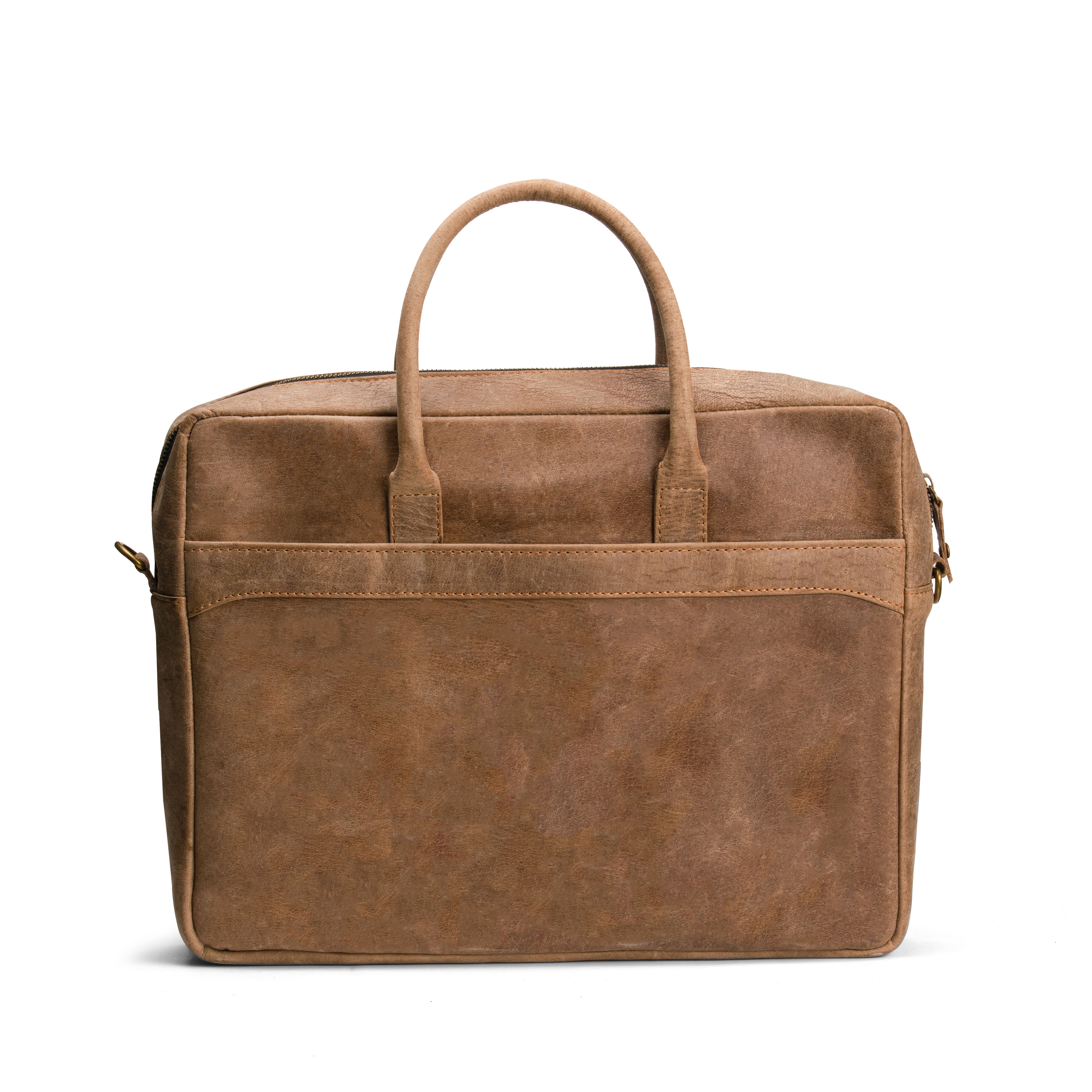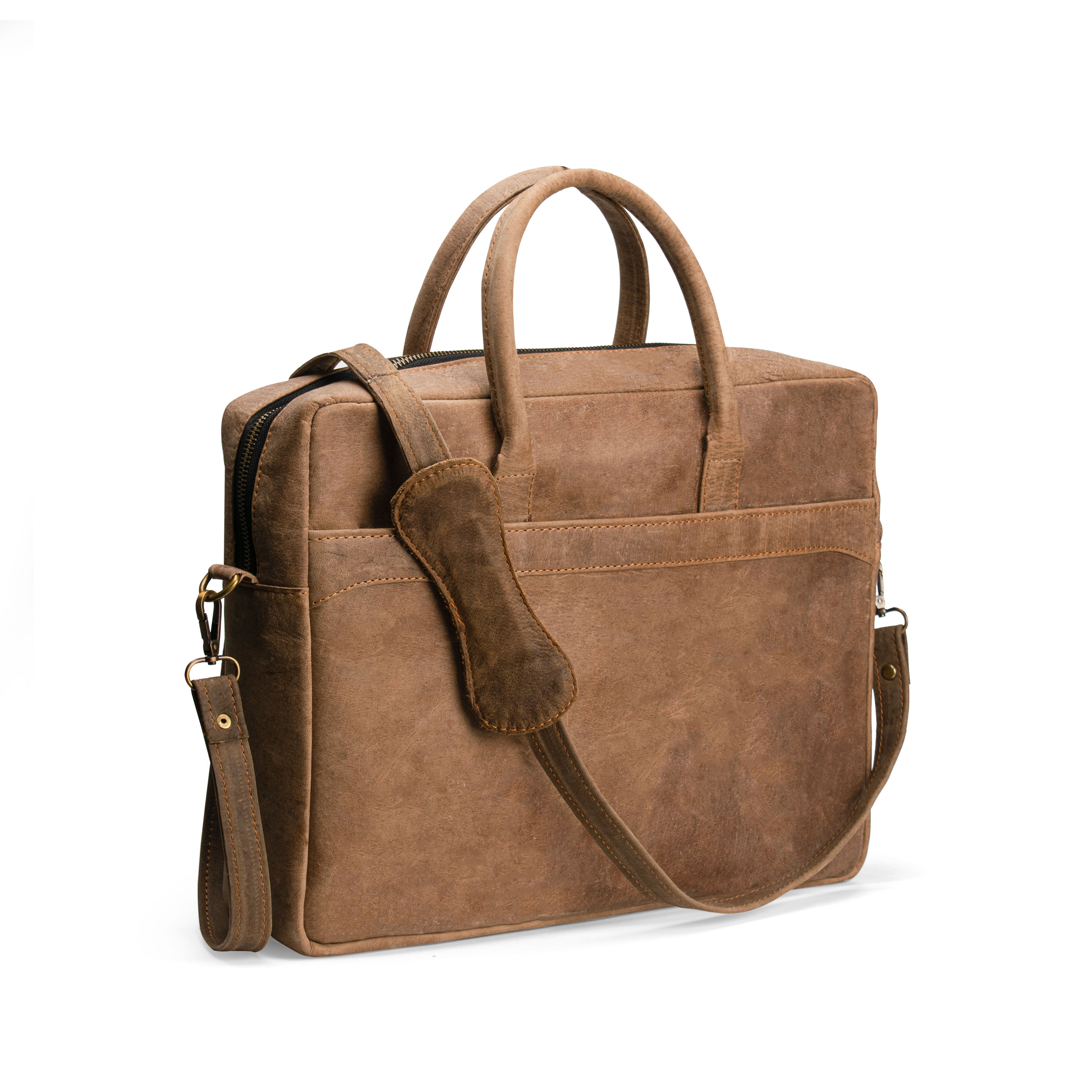 Sophisticate your workday essentials with our Rustic Brown Laptop Bag. Its rich, earthy tone and impeccable craftsmanship make it the perfect accessory for any professional setting. Made from luxurious leather, it is roomy enough for all your stuff and shows off an Extra Back Pocket along with plush Top Handles.Engineered to withstand daily wear, it's durability ensures it remains your trusted companion for years.